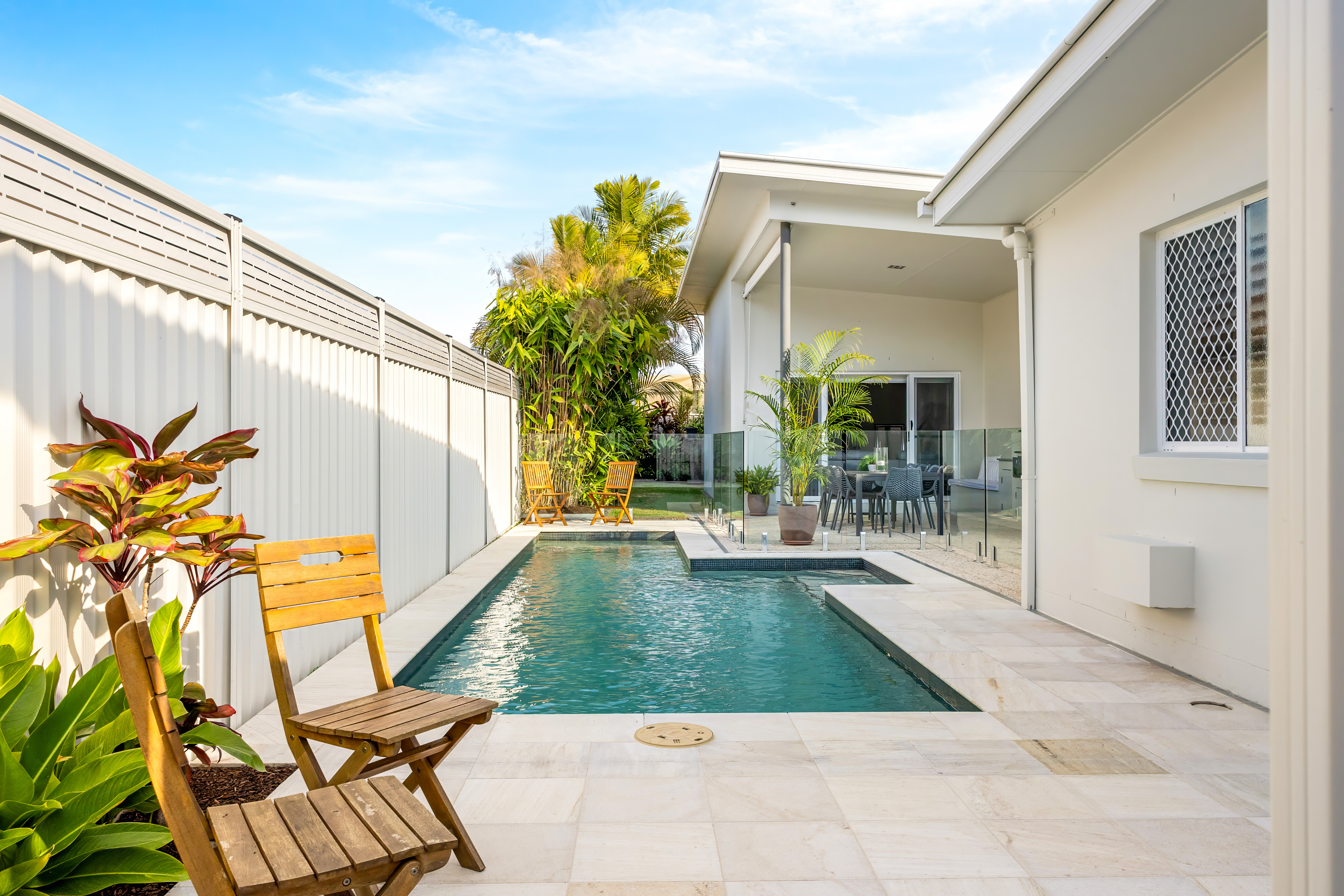 This immaculate four-bedroom home radiates a light, airy coastal vibe, adorned with clean, soft finishes. High ceilings and expansive windows create natural light with a seamless indoor-outdoor flow, leading to multiple serene spaces. Discover your private oasis with a sleek swimming pool, multiple entertainment and dining areas, a spacious deck nestled amongst the lush tropical gardens and floral aromas such as mature jasmine, lemon myrtle & rosemary.